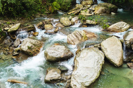 Rocky Waterfall in flowing down into small rocky river, in Hualien Taiwan.