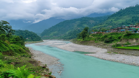 A powerful image captures a raging river swollen by heavy rain after a devastating flood through a dramatic mountain landscape. The flowing, muddy water carries debris, highlighting the damage caused by the natural disaster. This scene illustrates the aftermath of a storm, potentially impacting houses and highlighting the consequences of deforestation and climate change. Ideal for illustrating articles on weather, ecological impacts, and environmental catastrophes.