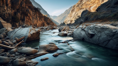 This captivating image showcases a serene river flowing over smooth stones, highlighting the clear turquoise water amidst a rocky landscape that invites tranquility.
