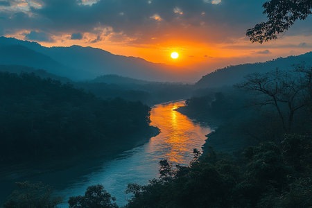 A breathtaking view of a calm river during a misty sunrise. The warm sun reflects in orange on the teal water, with birds flying overhead and silhouetted hills in the background.