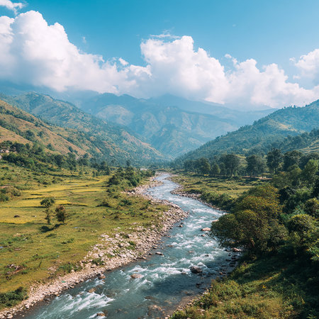 Captivating landscape featuring a flowing river bordered by lush hills under a dramatic sky. Ideal for nature lovers seeking tranquility and beauty.