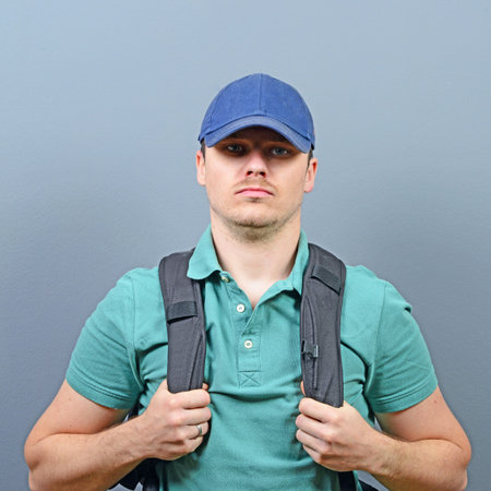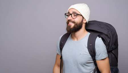 Portrait of man with backpack against gray background - Explorer concept