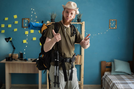Young bearded man traveler preparing for hiking pointing and choose you, gesture at home. Backpacking hiking