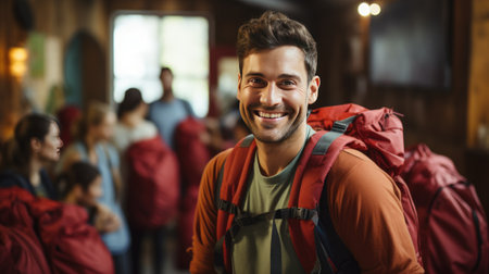 Portrait of smiling man with backpack standing in corridor at camping site