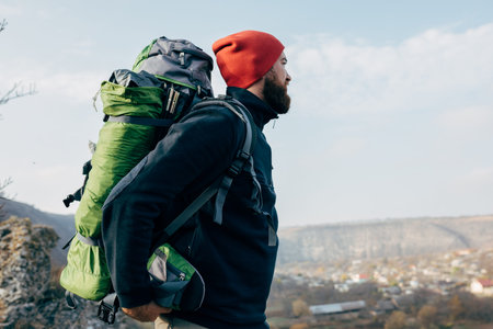 Side view outdoors portrait of young man looking to the horizon in mountains with travel backpack and red hat. Traveler bearded male relaxing after trekking during journey. Travel, lifestyle, sport