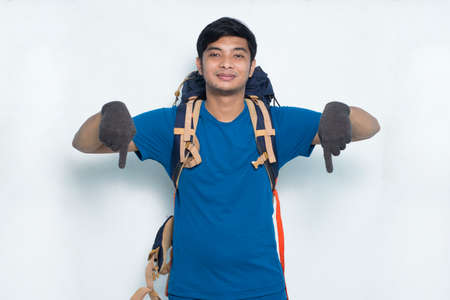 Young asian hiker man with backpack pointing finger on empty space on white background