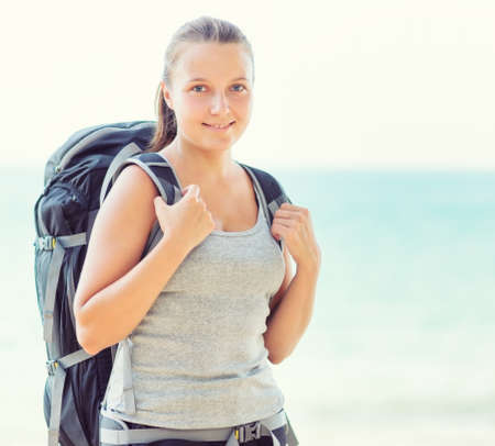 Young female backpacker on a beach