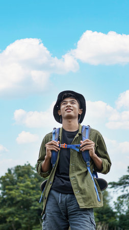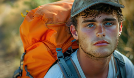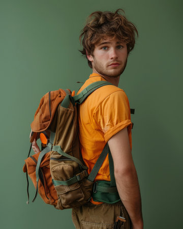This captivating image captures the essence of adventure and exploration through the poignant portrait of a young male traveler Standing against a verdant green backdrop, he exudes a sense of determination and wanderlust His rugged backpack, laden with experiences, symbolizes the journey he has embarked upon The viewer is drawn into the traveler's gaze, mirroring their own desire to embrace the unknown and forge unforgettable memories AI Generative