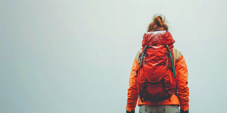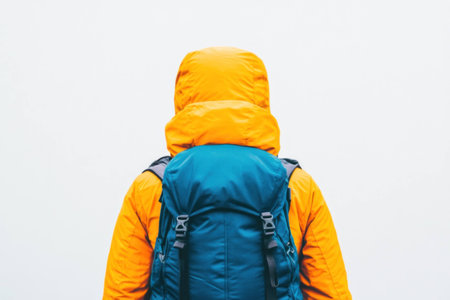 A person wearing a bright orange jacket and teal backpack stands against a minimalistic white background, evoking feelings of adventure and exploration in outdoor activities