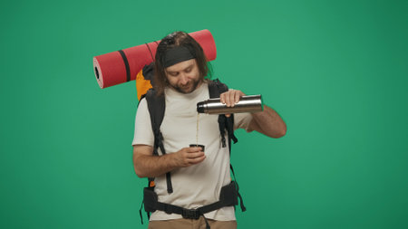Man tourist with backpack pours tea in cup from bottle. Isolated on green background.