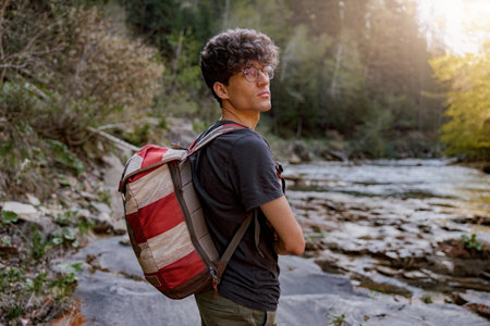 Handsome young male hiker with backpack standing at river in mountains. Trekking concept.