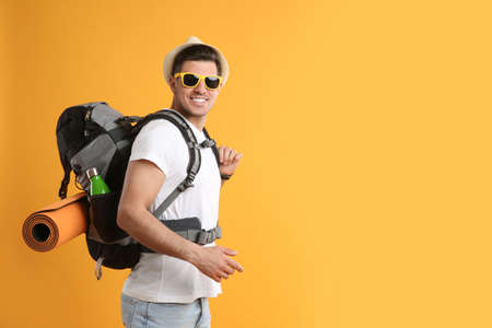 Male tourist with travel backpack on yellow background, space for text