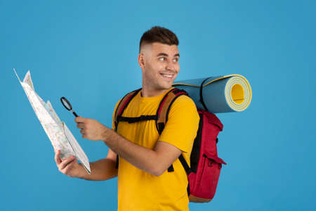Handsome young backpacker with map and loupe planning his route on blue background