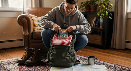 A young person kneels on a rug, packing a green backpack with a book and striped shirt. Hiking boots and a map are nearby, suggesting preparation for a trip, hike, or school.