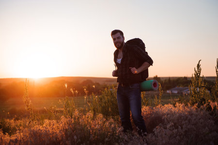 Bearded hiker enjoying outdoors at sunset