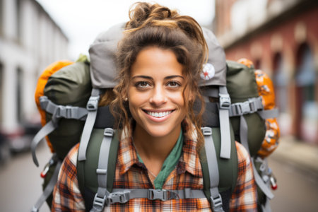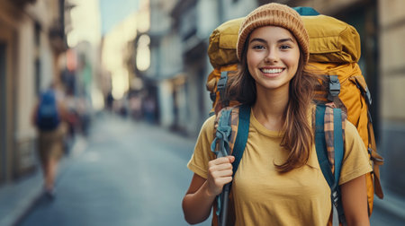 Smiling young woman with a large backpack walks through a city street, enjoying her travel adventure.