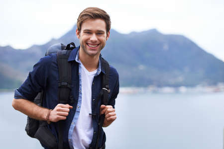 Best hiking destination. Portrait of a handsome young man standing with a backpack in the outdoors.