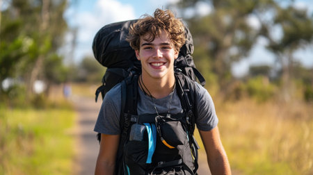 A young man with a backpack is smiling and walking on a path. The backpack is black and has a blue strap