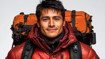 A cheerful outdoor enthusiast dons a puffy jacket, carrying adventurous gear.