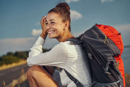 Portrait of a delighted European female tourist, capturing the joy of her travel experience
