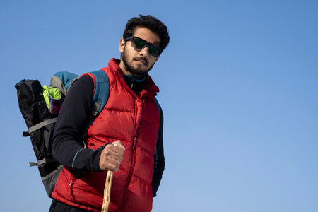 Young indian traveler boy trekking over a rocky mountain, standing on the top of the mountain with a stick in his hands. Freedom and adventure concept with copy space.