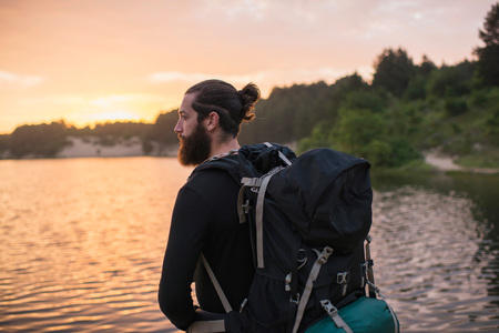 Male traveler with backpack and karimat in nature by the lake.