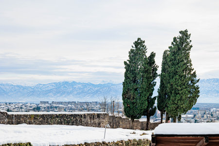 Peaceful winter landscape of Kutaisi, Georgia. Snow-covered city and distant Caucasus mountains create a serene, cold-season atmosphere