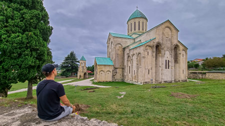 A male tourist with a panoramic view of Bagrati Cathedral in Kutaisi,Imereti,Georgia (Sakartvelo),Central Asia,Europe.Historical architecture,17th century.Cathedral of the Dormition