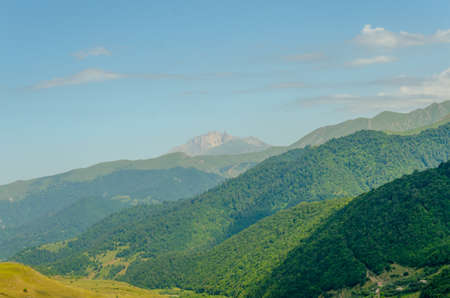 Caucasian Mountain ranges and valleys at Gudauri, Georgia. Summer day on the military-Georgian road. Rapid weather change in the mountains