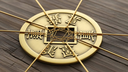 The chinese lunar coin has intricate designs and is connected by gold wires on a wooden surface.