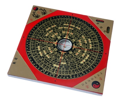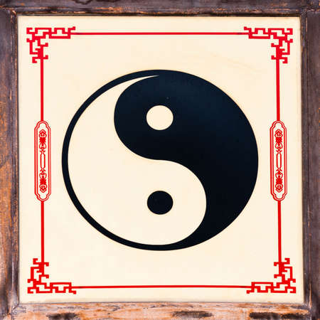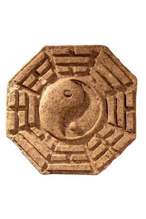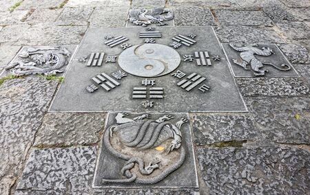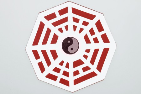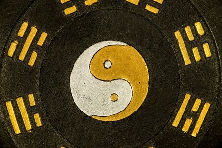 Famous chinese sign Yin and Yang surrounded by Trigrams and hieroglyphs