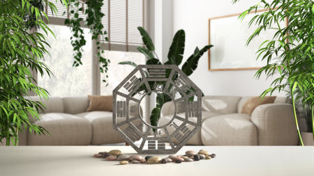 Wooden table shelf with ba gua, pebble stone and bamboo plants, over minimal white living room with sofa and many houseplants, urban jungle interior design