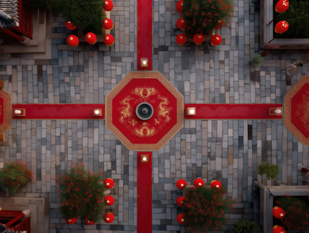 Chinese courtyard seen from above. Featuring striking red lanterns and intricately decorated octagonal structures with golden dragon motifs. Creating a festive symmetrical pattern on grey stone paving