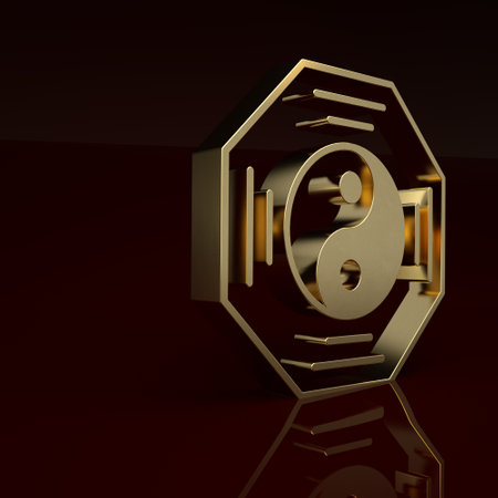 Gold Yin Yang symbol of harmony and balance icon isolated on brown background. Minimalism concept. 3D render illustration