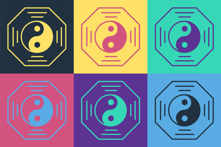 Pop art Yin Yang symbol of harmony and balance icon isolated on color background. Vector.