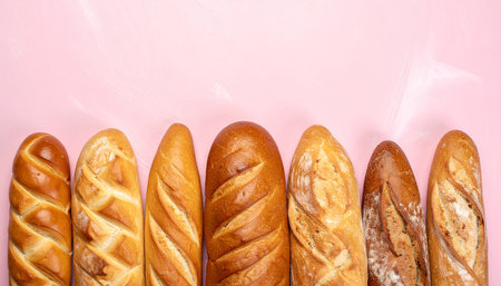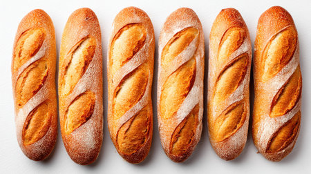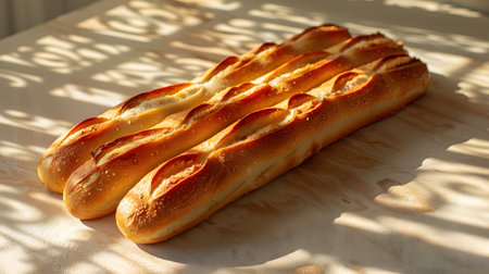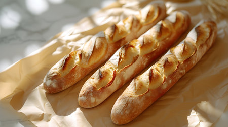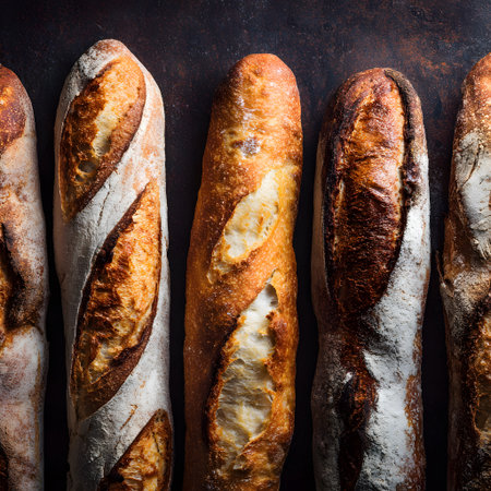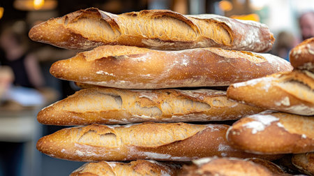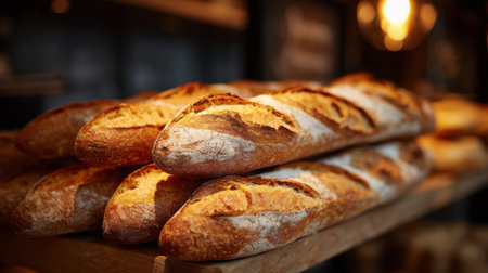 A close-up view of freshly baked baguettes showcases their golden crust and inviting texture, perfect for food lovers and bakery enthusiasts seeking charm and warmth.
