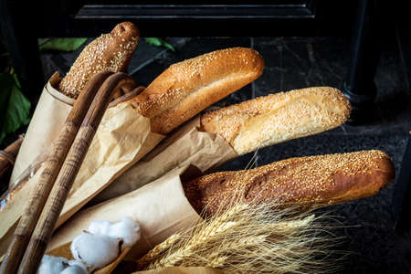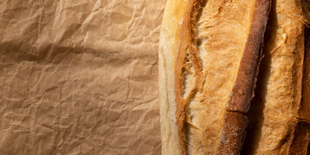 Delicious french baguette close-up, on baking paper, background with copy space. Concept of development of craft bakeries