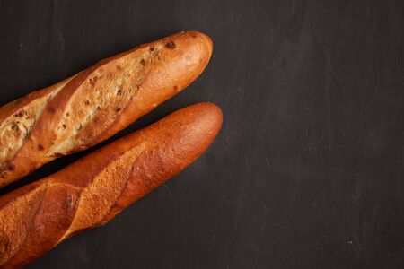 Two crispy french baguettes lie dark black table background sesame seeds Classic french national pastries Copy space Concept for menu or advertising