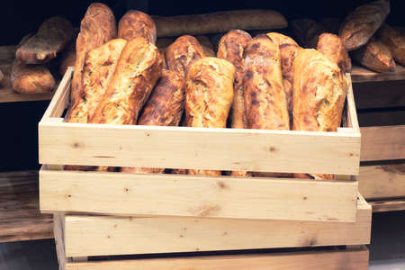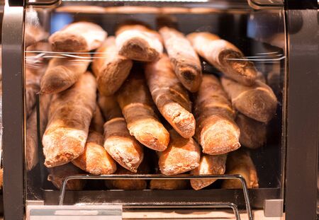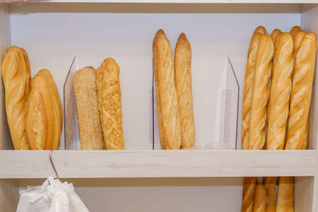 Fresh tasty Baguettes on bakery shelves. Concept of french delicious food