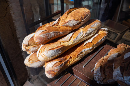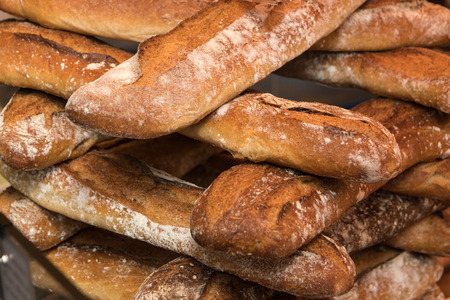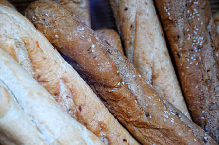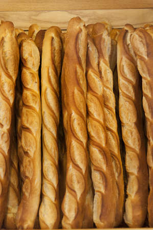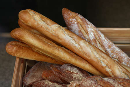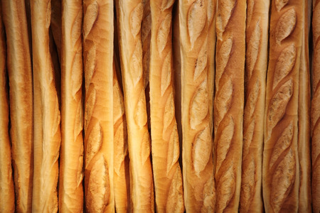 French bakery in Lyon, many fresh baked baguettes breads ready for sale close up
