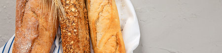 Fresh bakery food. Crusty loaves of mixed breads and buns and ears of wheat on rustic table background. Top view and copy space for text. Banner wide format.
