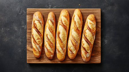 Top view of artisanal mini baguettes on a wooden board, emphasizing their homemade quality and warm, fresh-baked appearance