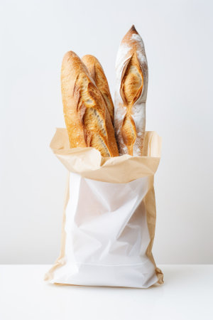 Freshly baked French baguettes neatly placed in eco kraft paper bags against a minimalist white background.