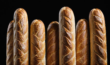 A row of freshly baked baguettes stand tall against a black background