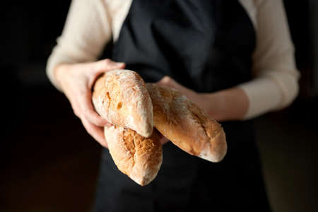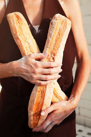 close up of female baker holding baguette bread