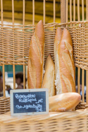 Baguettes in the basket on the street market bakery in France