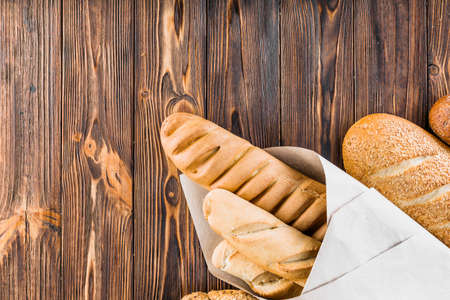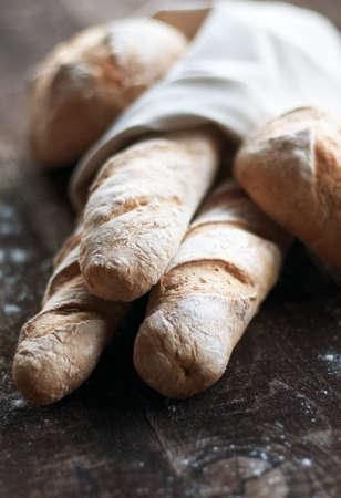 Four baguette bread loaves in paper bag on wooden background