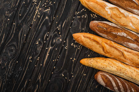 top view of fresh baked baguette loaves on wooden black surface