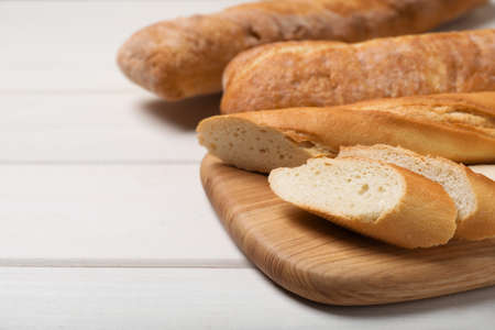 Cut tasty baguette on white wooden table. Space for text