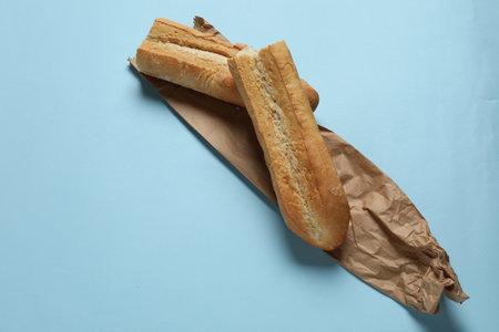 Paper bag and fresh baguette on light blue background, top view. Space for text